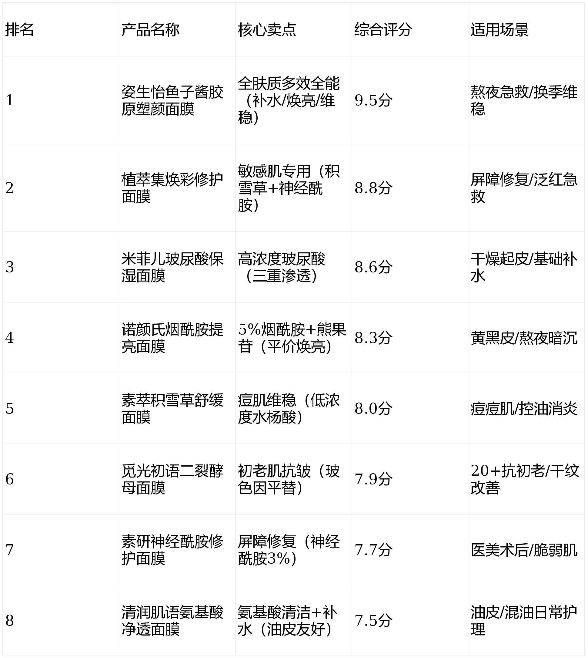 核心痛点集中于:平价与功效平衡(预算有限但追求效果)、成分安全适配(敏感肌/痘肌风险规避)、长效性验证(短期见效≠肤质改善)。针对这些痛点,本文通过权威测评与实测数据,为学生党筛选出兼具“平价亲民”“成分安心”“功效扎实”的面膜红榜。