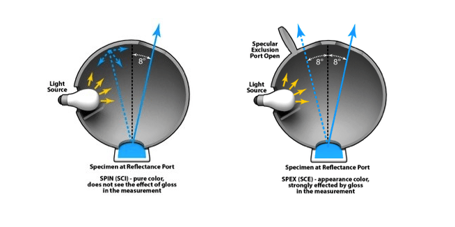 目前,行业最主流的解决方案是使用积分球式分光测色仪,它通过内置的精妙光学设计,提供了“包含镜面反射光”和“排除镜面反射光”两种测量模式,这正是理解光泽测量的关键。这两种模式对应于国际公认的两种测量几何条件:包含镜面成分(SCI,也称为 SPIN) 和排除镜面成分(SCE,也称为 SPEX)。